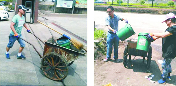 ,在圍墻邊拾撿垃圾,室外40度高溫